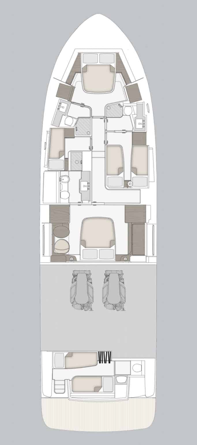 Princess M effortlessly redefines luxury by blending timeless Italian craftsmanship with contemporary sophistication. Its soul lies in a masterfully designed layout, where space, comfort, and elegance coexist perfectly. Thanks to generous dimensions and an advanced stabilizer system, every journey promises serene cruising at its finest. The main deck embraces the Navetta-style philosophy, offering a luminous day zone flooded with natural light through sweeping windows, evoking a sense of endless freedom. Discreet divisions between crew and guest areas enhance privacy and ease of living. Below deck, an exquisite main cabin and three stylish guest cabins await discovery. Princess M boasts a spectacular flybridge with a relaxed stern lounge, while the versatile cockpit transforms effortlessly from a chic dining space into a tranquil retreat under the open sky.