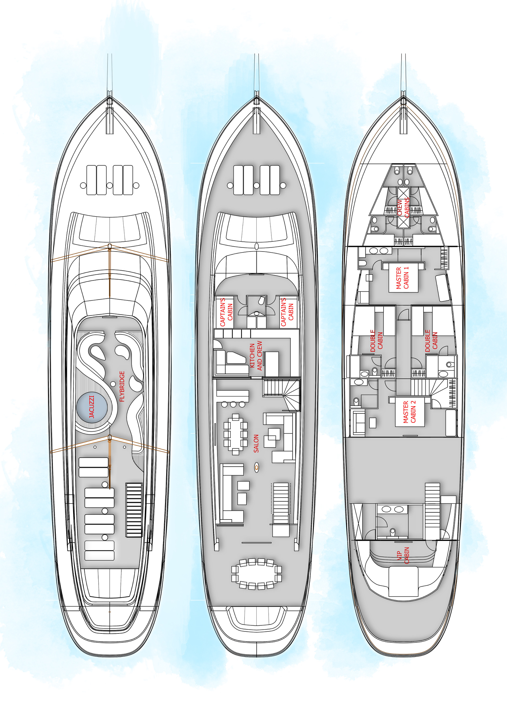 6. 3 master cabins stretching from side to side of the yacht with large windows providing ample ambient light and excellent views of cruising grounds